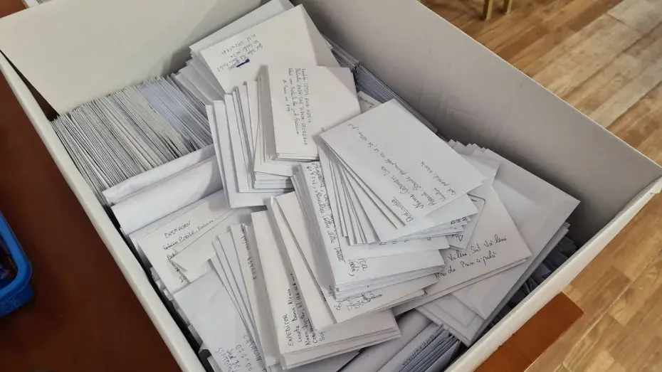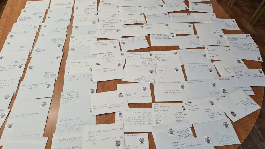Avem 1500 de scrisori pe care punem timbre și le trimitem.